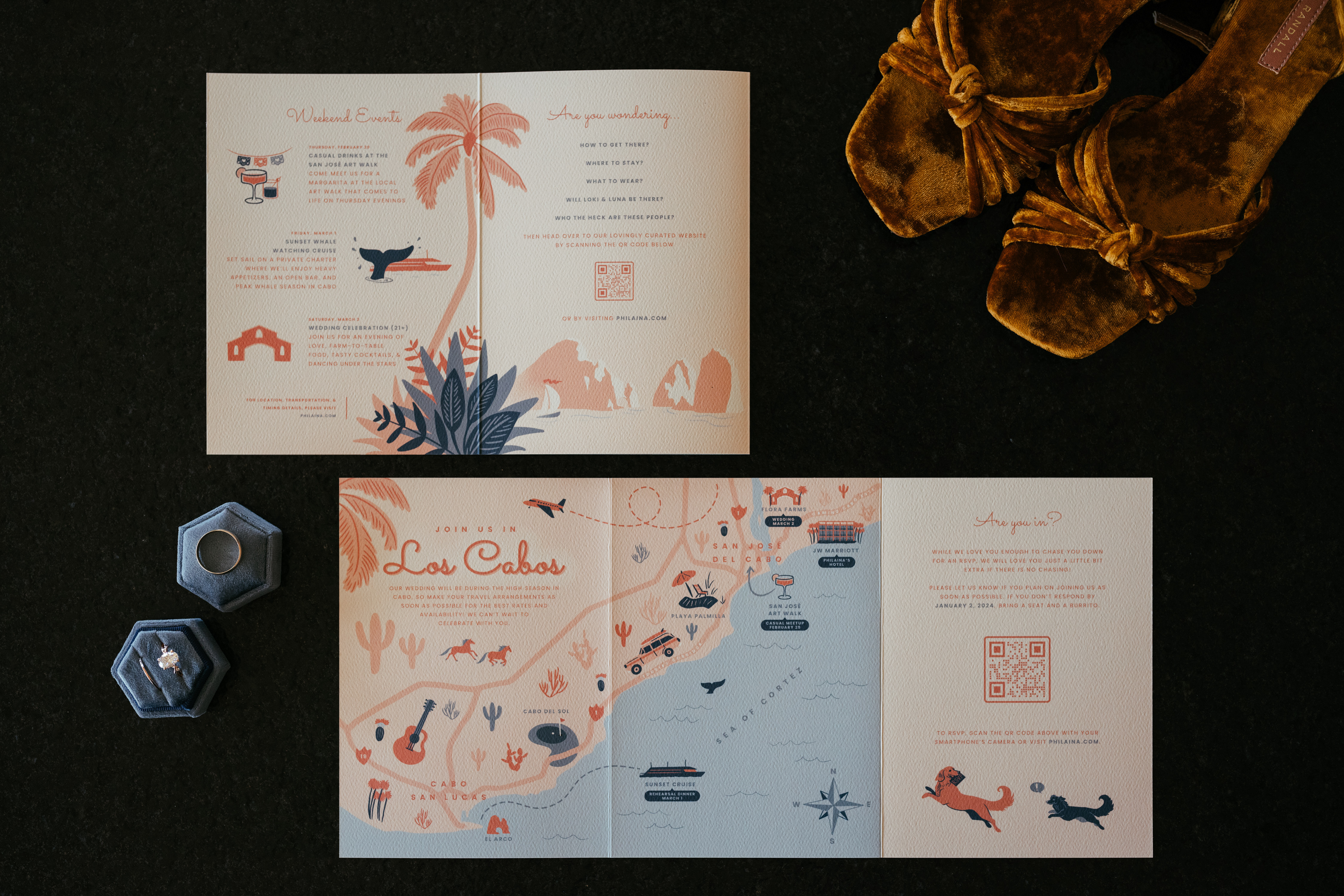 On the back spread, I created a hand-illustrated map to clarify event locations and help guests distinguish between San José del Cabo and Cabo San Lucas. Since travel logistics were key, we wanted our wedding website to be the primary source of truth, ensuring guests always had the most up-to-date details. To reinforce this, we included both QR codes and a URL on nearly every panel, making it easy for guests to access the latest information as the event approached.